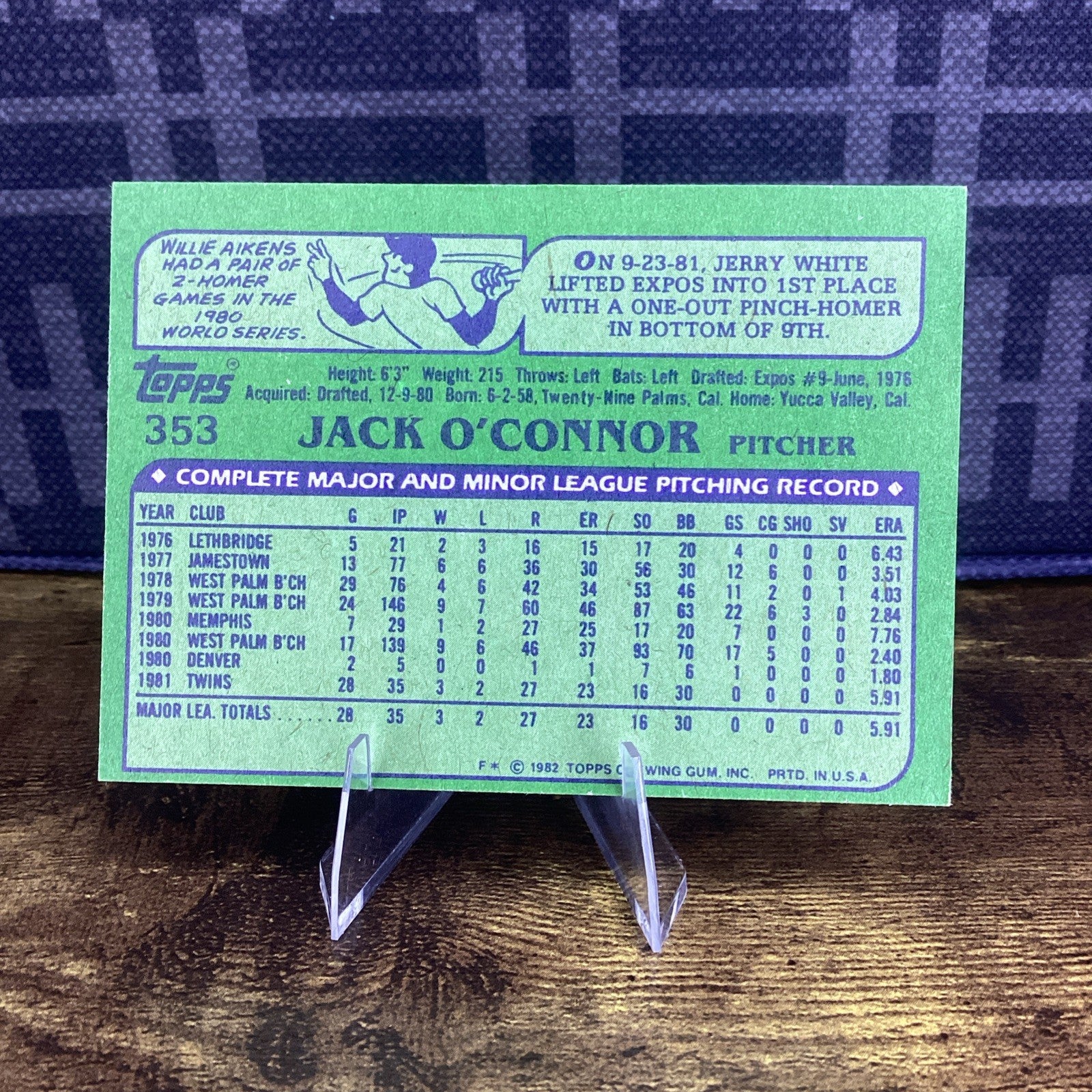 The 1982 Topps Jack O'Connor #353 Minnesota Twins trading card is an original baseball card featuring the player Jack O'Connor from the Minnesota Twins. This standard-sized card is hard-signed, made of card stock, and manufactured by Topps in the United States. With a 20 Pt. thickness, this English-language sports trading card is part of the 1982 Topps set and includes features such as being a base set and a rookie card. It is a valuable collectible for fans of Major League Baseball and the Minnesota Twins.