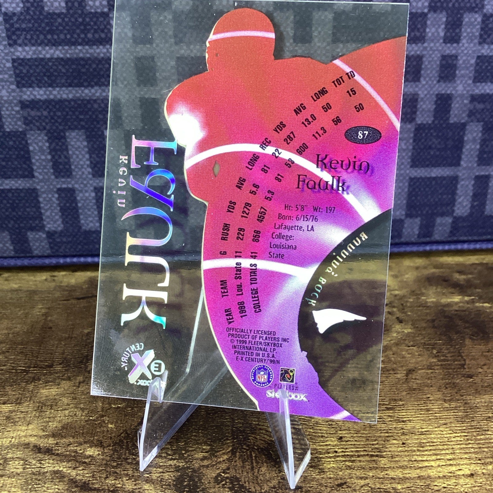 The product is a 1999 Skybox EX Century Kevin Faulk #87 Rookie RC Clear RAINBOW HOLO trading card featuring the football player Kevin Faulk from the New England Patriots. This single card from the set manufactured by Fleer/Skybox in 1999 is made of card stock and is an original rookie card. The card is in English and has a clear parallel/variety, making it a desirable collectible for fans of NFL memorabilia.
