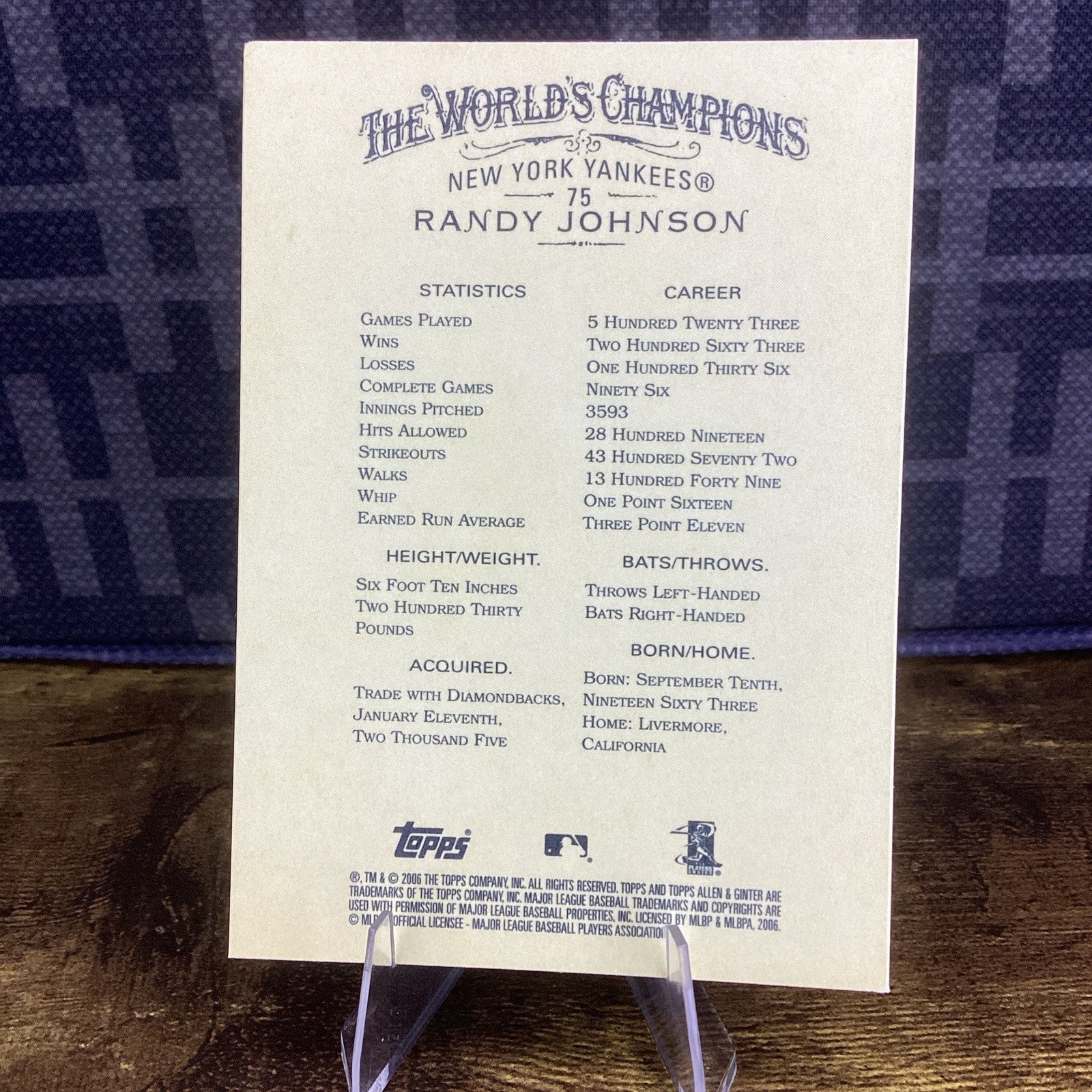The 2006 Topps Allen & Ginter #75 Randy Johnson BASEBALL Card is a standard-sized trading card featuring the Hall of Famer from the Major League Baseball (MLB) era. Manufactured by Topps, this original card is made of card stock and is part of the base set for the 2006 season. The card showcases Randy Johnson as a player for the New York Yankees and is a must-have for any baseball card collector looking to add a piece of sports history to their collection.