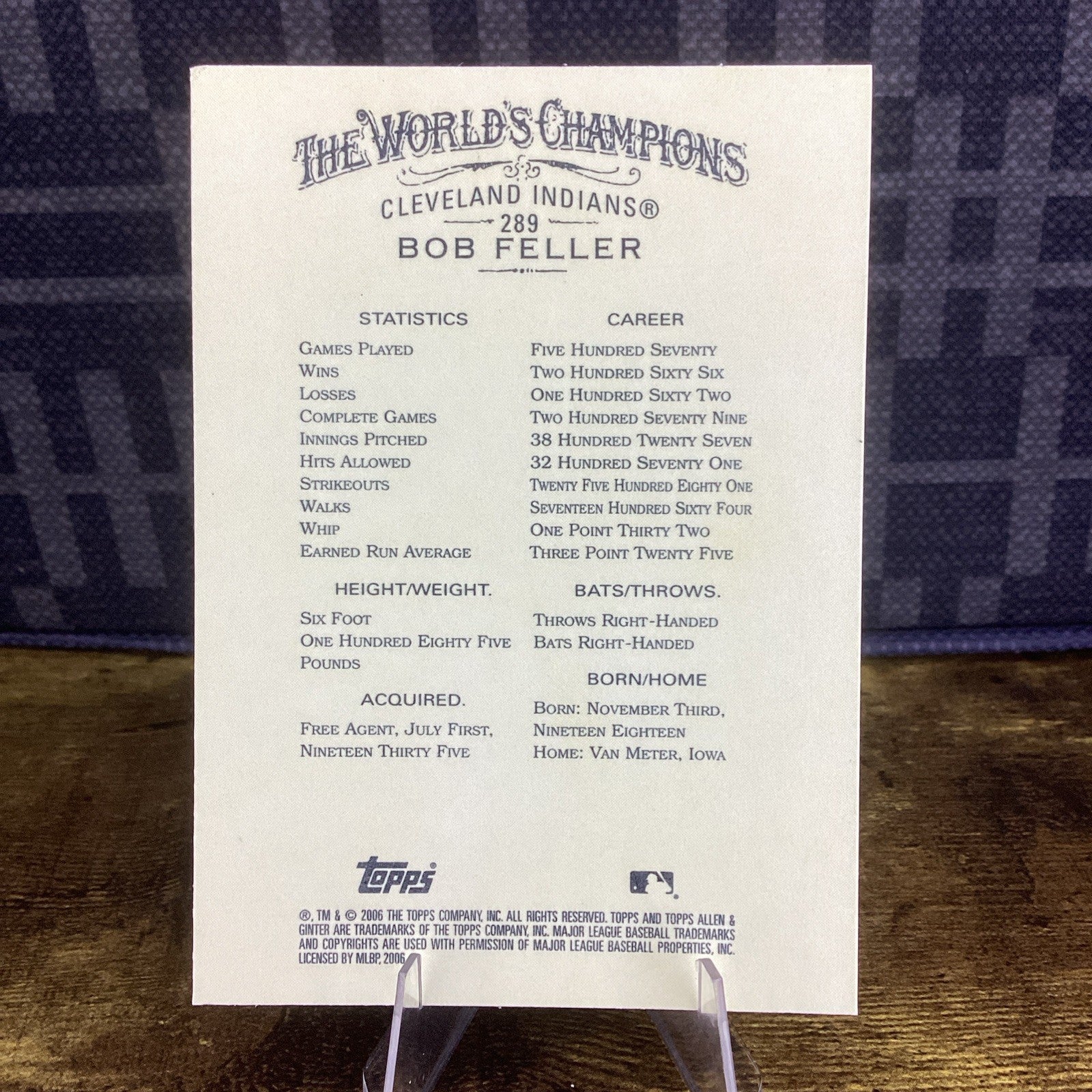The 2006 Topps Allen & Ginter's #289 Bob Feller Cleveland Indians trading card is a standard-sized sports trading card featuring the Major League Baseball player Bob Feller. Manufactured by Topps in 2006, this original card is part of the Allen & Ginter's set and belongs to the base set for that year. The card does not feature an autograph but showcases Feller in his Cleveland Indians uniform, making it a desirable collectible for fans of both baseball and the team.