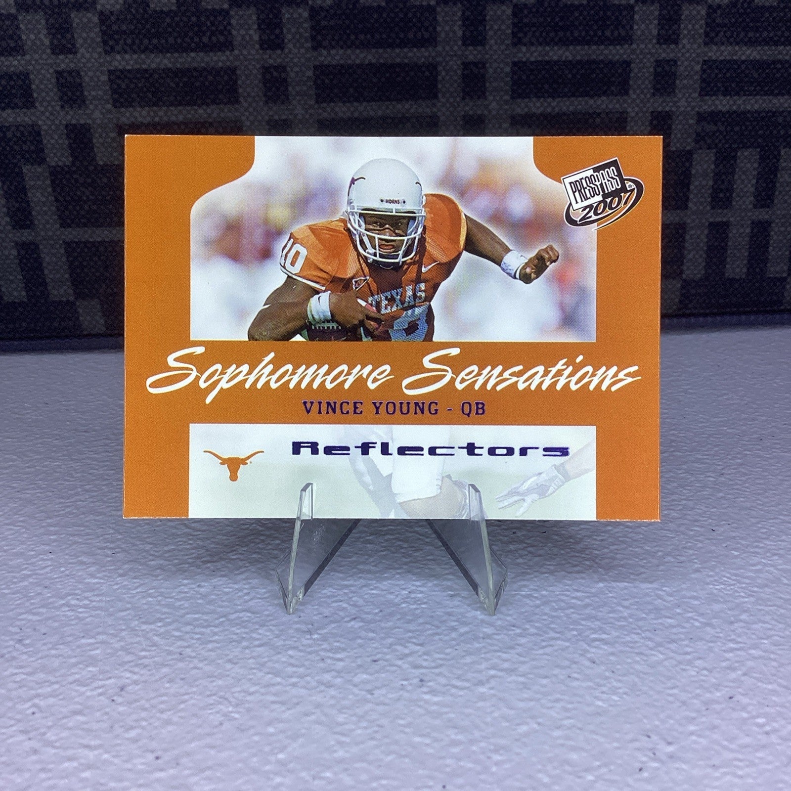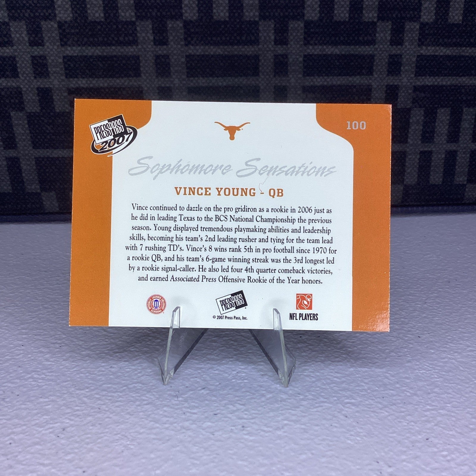 Capture a slice of football history with the 2007 Press Pass Sophomore Sensations Vince Young #100 card. This collectible features the renowned Texas Longhorns quarterback during his standout second season, offering fans and collectors a tangible piece of Vince Young's illustrious career.
