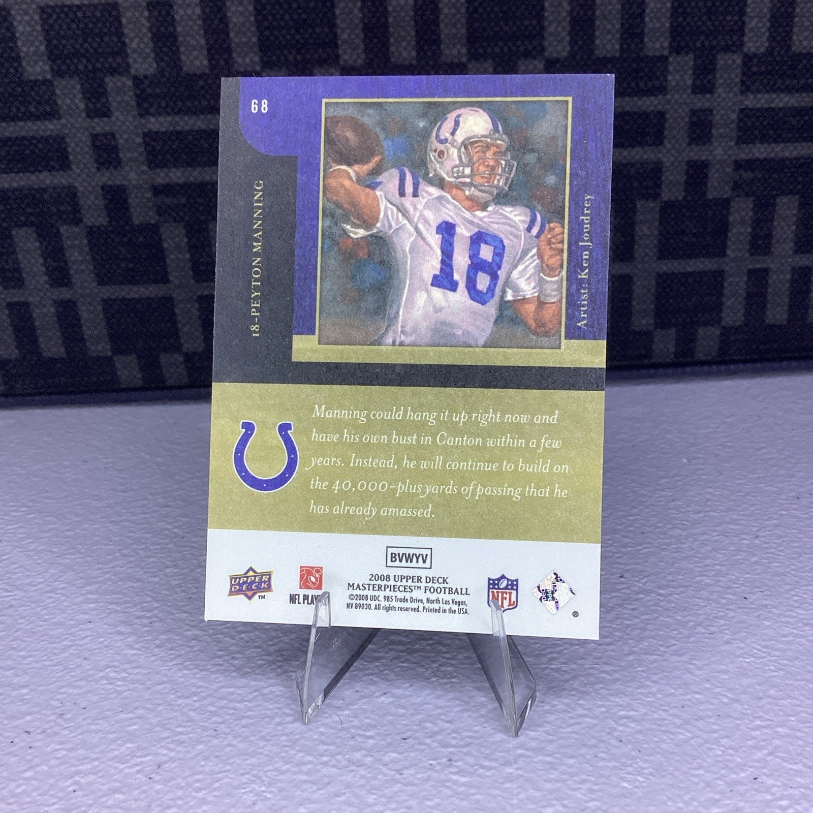 Crafted by Upper Deck, a trusted name in sports card manufacturing, this card belongs to the 2008 Upper Deck Masterpieces set, celebrated for its artistic design and high-quality production. Without a signature, the card maintains its original state, preserving the authenticity of its 2008 release. A must-have for any Peyton Manning admirer or football card enthusiast.