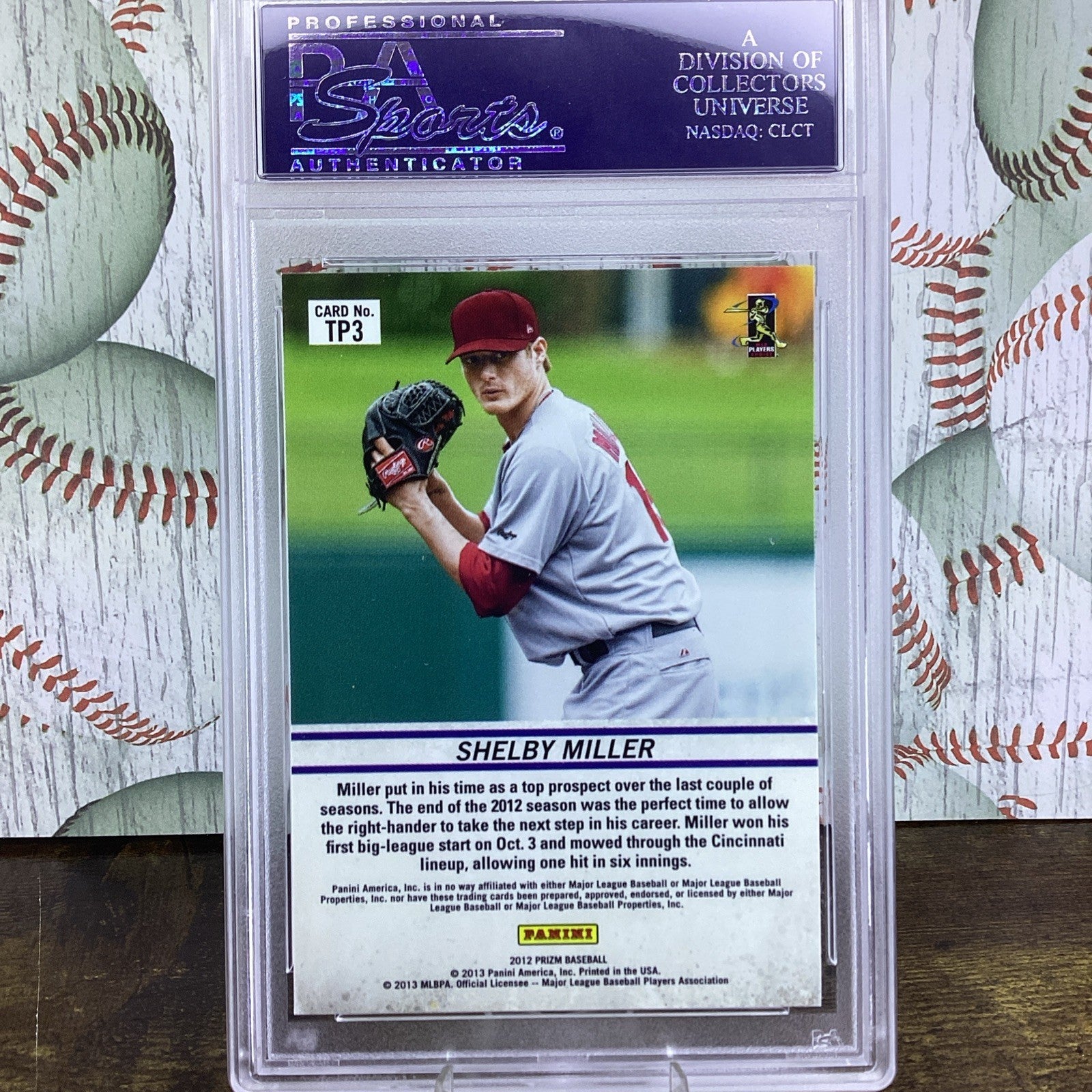 The 2012 Panini Prizm Top Prospects Shelby Miller #TP3 PSA Mint 9 is a single-insert trading card featuring baseball player Shelby Miller from the St. Louis Cardinals. This rookie card is from the 2012 Panini Prizm set and is made of 20 Pt. card stock. It is an original card manufactured by Panini America, Inc. in the United States, and it is part of the Top Prospects insert set. This collectible item is in English language and is a valuable piece for any baseball card collector.