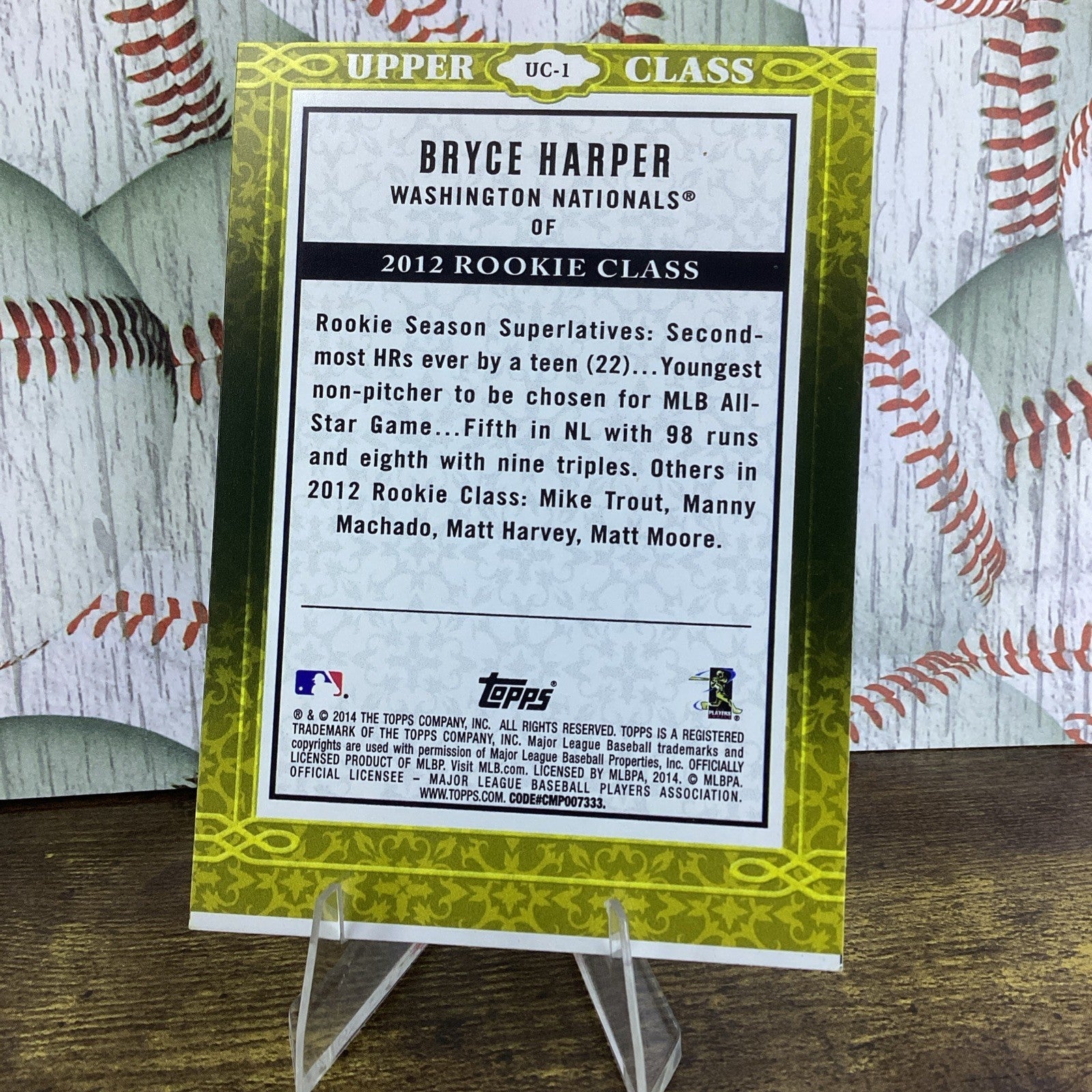 The product is a 2014 Topps trading card featuring Bryce Harper of the Washington Nationals from the Upper Class insert set. It is a standard-sized card made of card stock, with a 20 Pt. thickness. This original baseball trading card is part of the Major League Baseball (MLB) league and is in English language. With a card number of UC-1, it is a collectible item from the United States manufactured by Topps.
