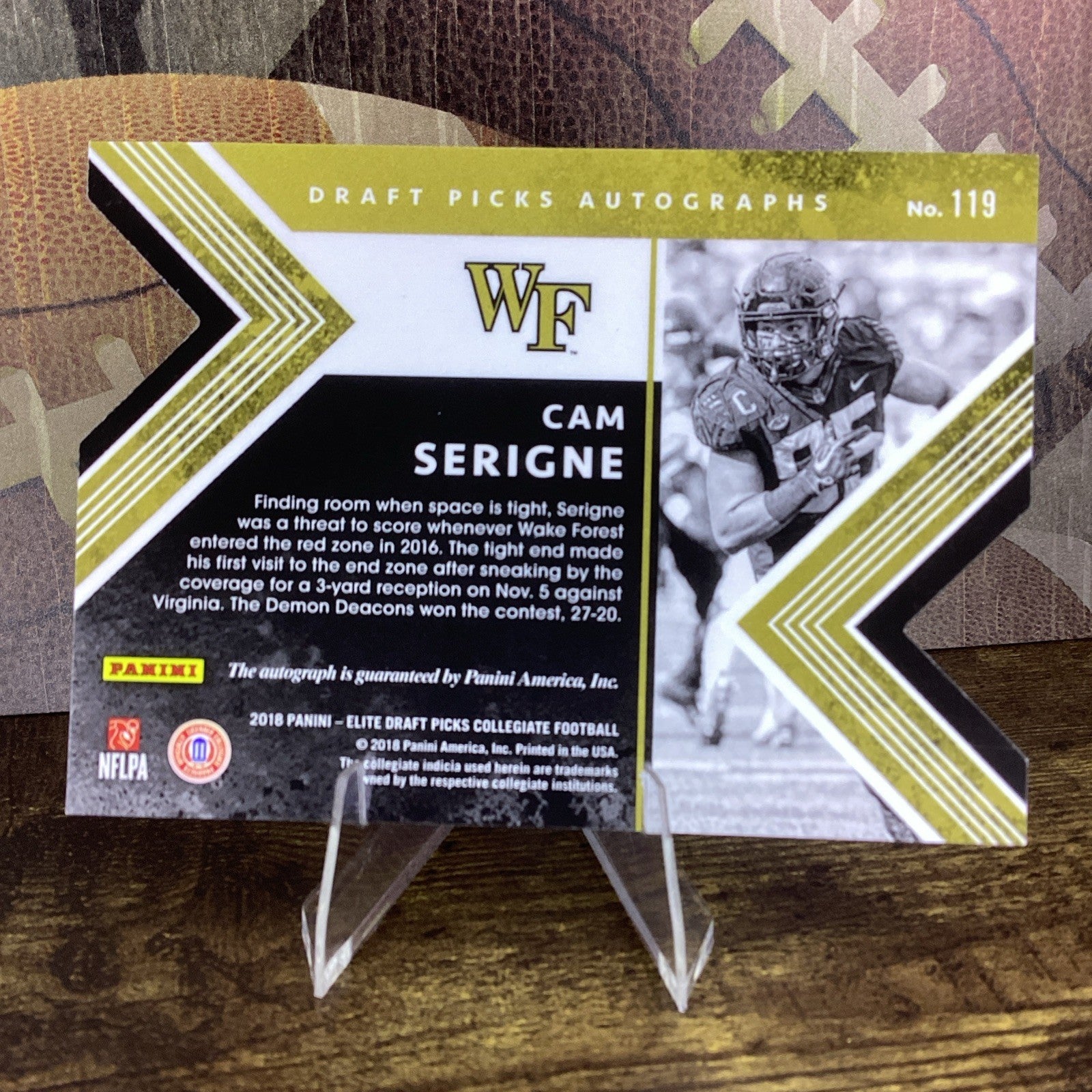 The 2018 Elite Draft Picks Cam Serigne RC #119 Status Red Rookie Auto #11/49 N1 trading card is a highly sought-after collectible featuring an autograph from Cam Serigne, a player from the Wake Forest Demon Deacons football team. This card is part of the 2018 Panini Elite Draft Picks set and is a status red die-cut autograph parallel variety, making it a rare and valuable addition to any sports trading card collection. With its limited print run and serial numbering, this original card is sure to be a standout piece for fans and collectors alike.
