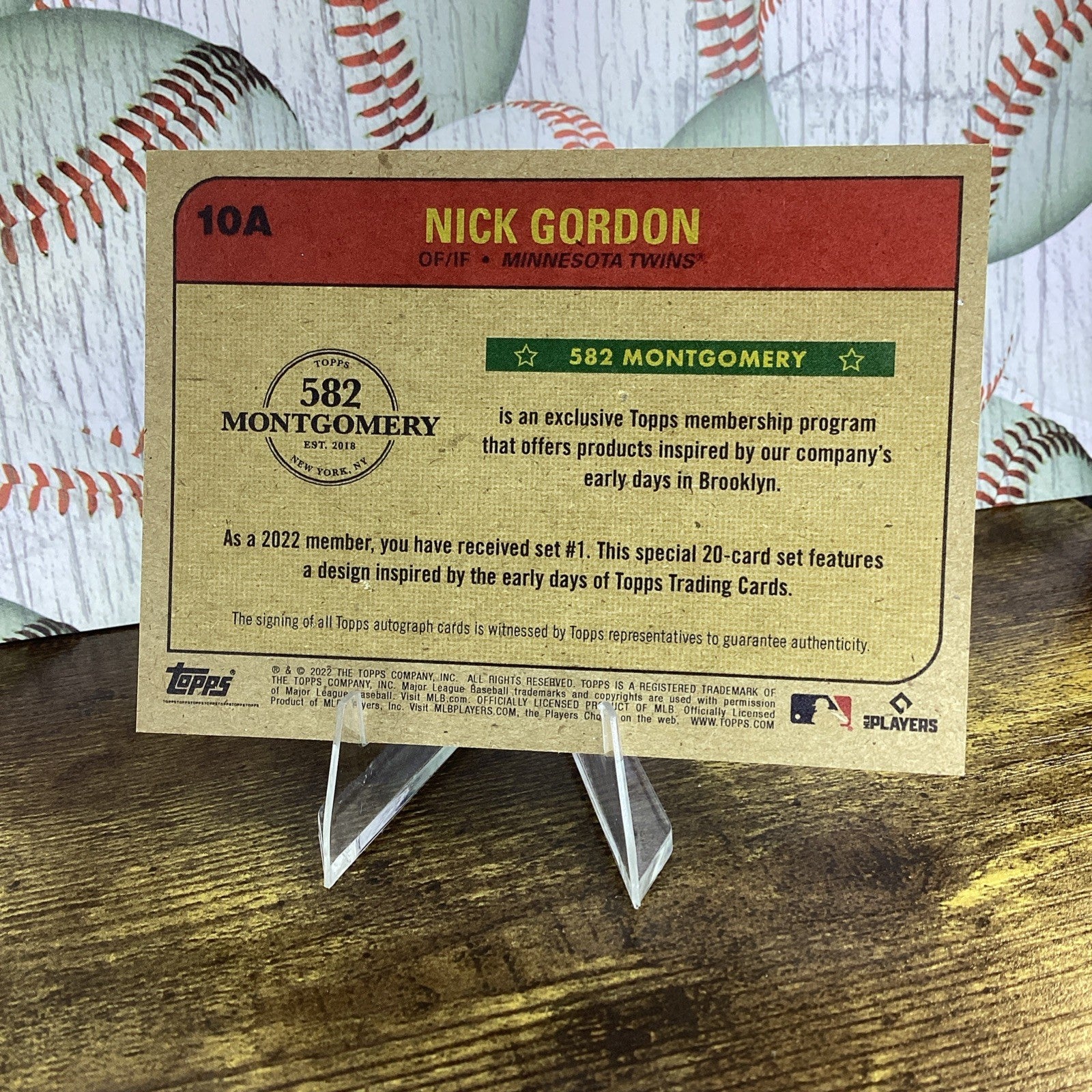 The 2022 Topps 582 Montgomery Club Set 1 Lost Design Nick Gordon RC ROOKIE CARD #10A is a highly sought-after baseball trading card featuring Nick Gordon of the Minnesota Twins. This autographed card, signed by Nick Gordon and authenticated by Topps, is made of standard card stock and is an original release by Topps. As a rookie card from the 2022 set, it holds value for collectors interested in Major League Baseball memorabilia. With its English language description and unique design, this sports trading card is a prized addition to any baseball card collection.
