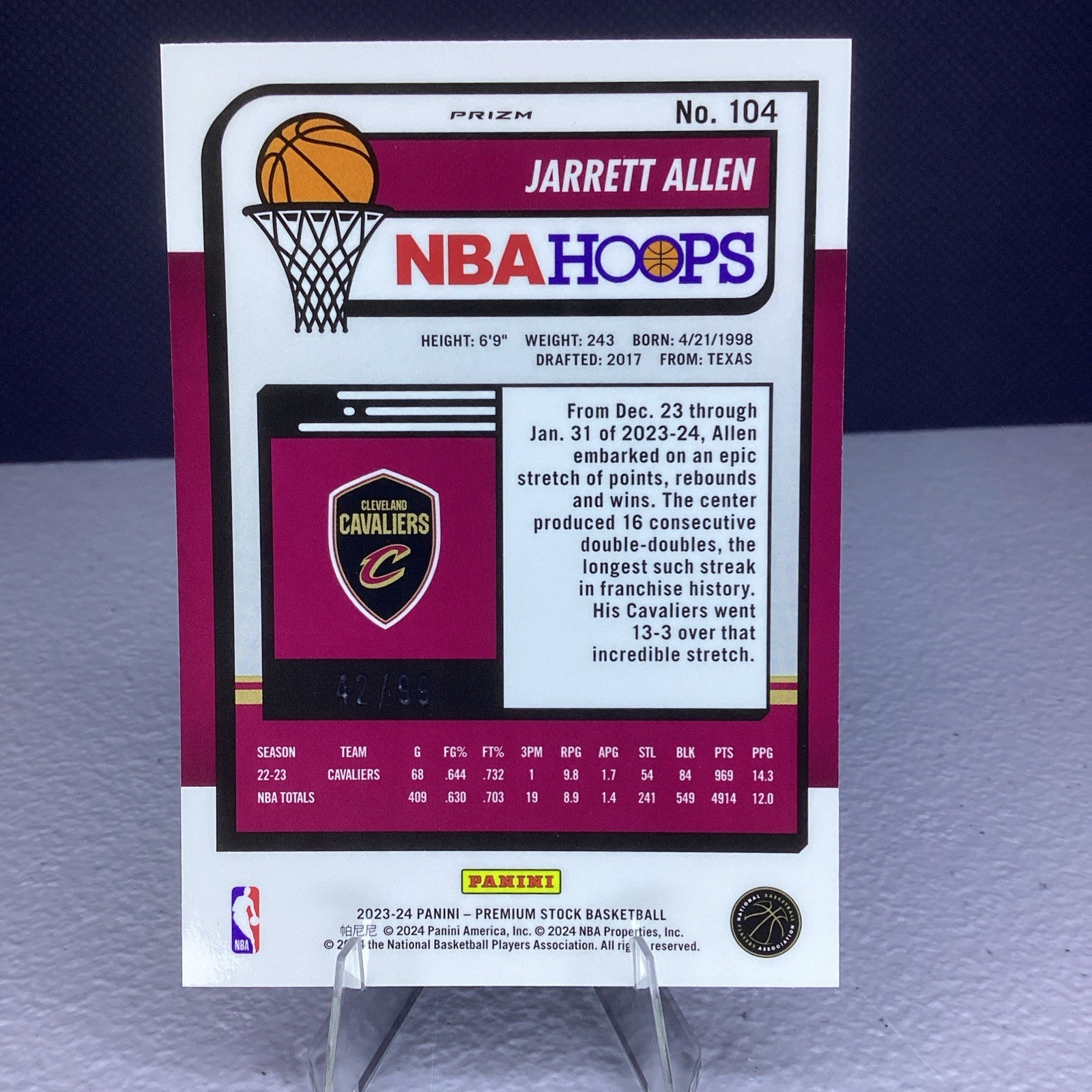 The product is a 2023-2024 Panini NBA Hoops trading card featuring Jarret Allen of the Cleveland Cavaliers. This particular card is a Blue Disco parallel, serial numbered 42/99, making it a rare and collectible item for basketball card enthusiasts. With its standard size and official NBA licensing, this card is a valuable addition to any sports trading card collection.