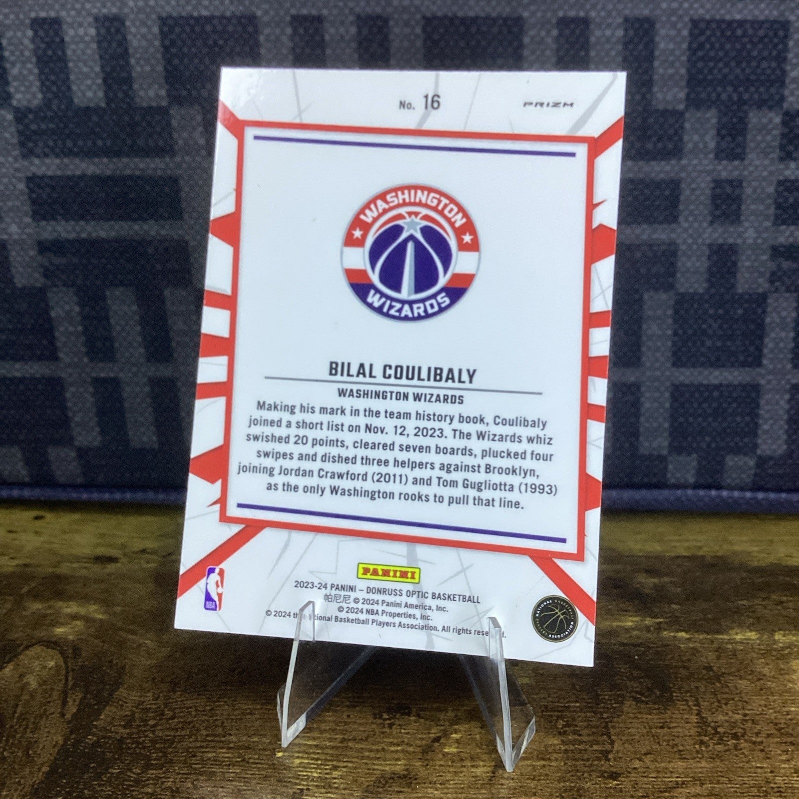 The product is a 2023-24 Donruss Optic Bilal Coulibaly My House Purple Prizm trading card featuring the Washington Wizards player. This basketball card is an insert in the set and part of the Optic parallel variety. The card number is #16, and it is a non-autographed collectible for fans of the National Basketball Association (NBA).