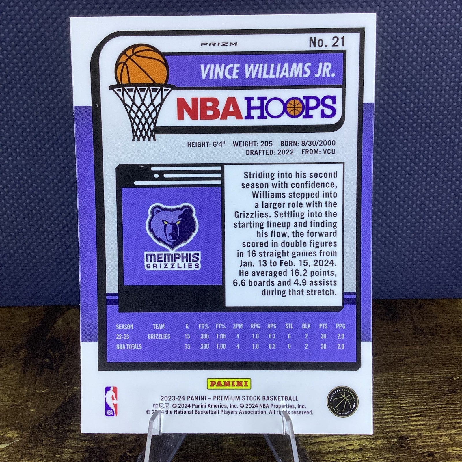 The product is a 2023-24 Panini NBA Hoops trading card featuring Vince Williams Jr. of the Memphis Grizzlies. It is a Pulsar Prizm variation, part of the base set for that season. This sports trading card is officially licensed by the National Basketball Association (NBA) and manufactured by Panini. It is a sought-after item for basketball card collectors and fans of the Memphis Grizzlies.