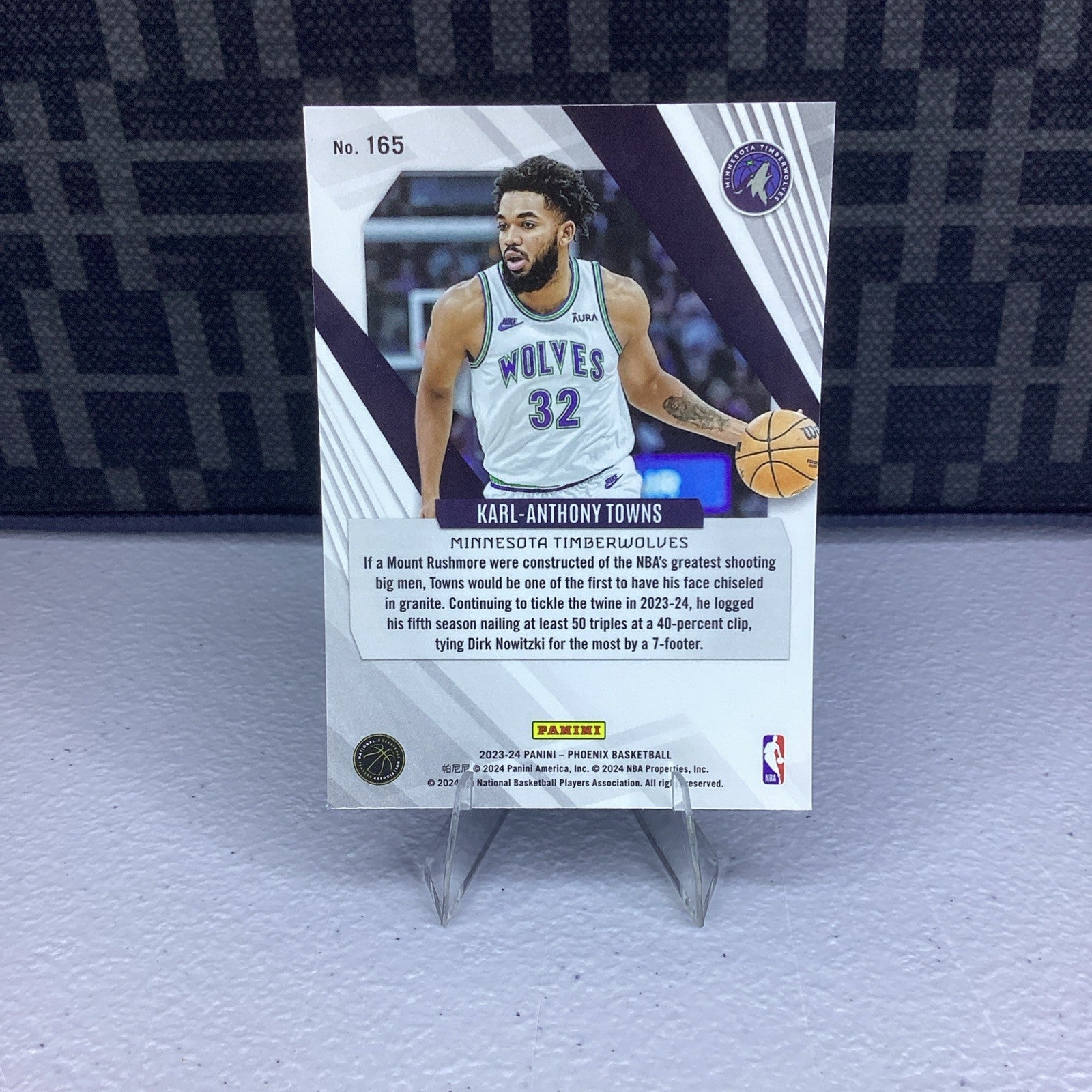 The product is a 2023-24 Panini Phoenix basketball trading card featuring Karl-Anthony Towns of the Minnesota Timberwolves. This base card from the set is not autographed and has a card number of 165. Manufactured by Panini, it is a collectible item for fans of the NBA and the Minnesota Timberwolves.