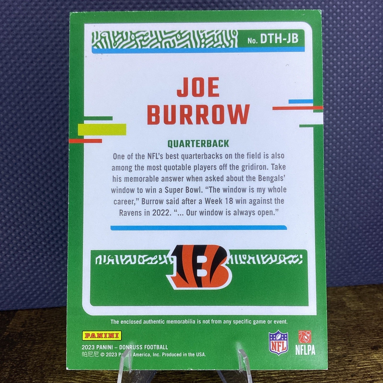 The 2023 Donruss Joe Burrow Donruss Threads Jersey #DTH-JB Bengals is a standard-sized sports trading card featuring Joe Burrow from the Cincinnati Bengals. Manufactured by Donruss in 2023, this card is part of the Donruss Threads insert set and includes a memorabilia piece of the player's jersey. The card is an original, not a reprint, and is in English. It is officially licensed by the National Football League (NFL) and is a must-have for fans of Joe Burrow and the Bengals.