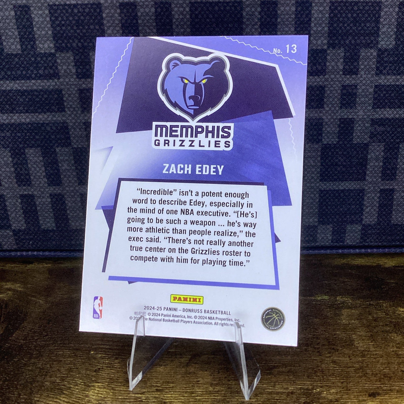 The product is a 2024-25 Donruss trading card featuring Zach Edey from the Memphis Grizzlies. This specific card is part of the Great X-Pectations insert set, showcasing the young player in anticipation of his future in the NBA. The card is a standard size, in English, and manufactured by Donruss in the United States. It includes no autograph or memorabilia, making it a desirable collectible item for basketball card enthusiasts and fans of Zach Edey.