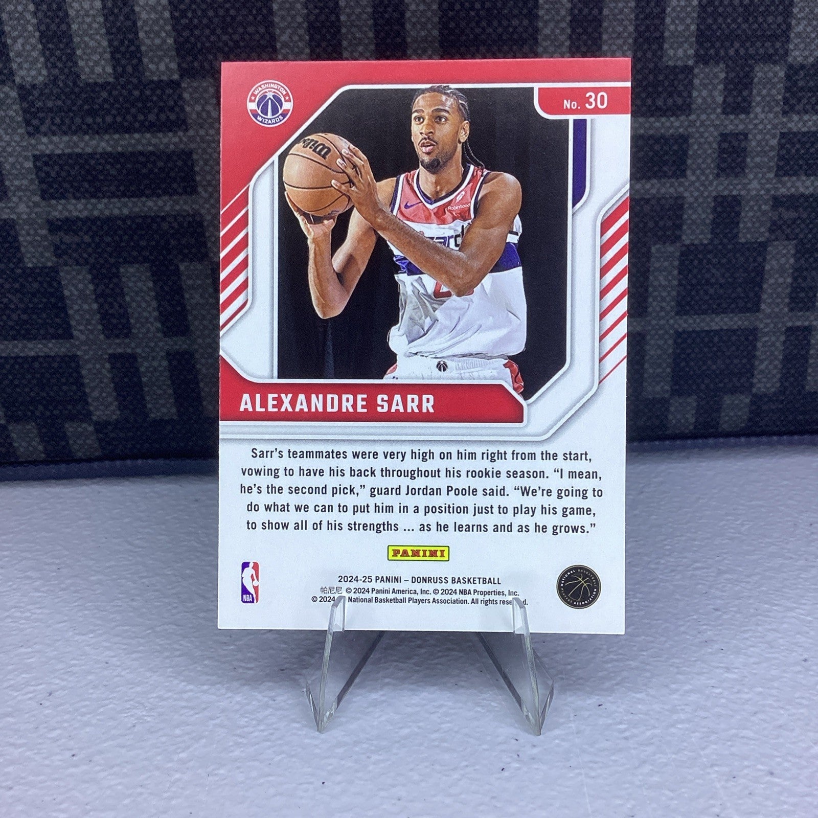 The product is a 2024-25 Donruss Franchise Features RC #30 sports trading card featuring Alexandre Sarr of the Washington Wizards from the National Basketball Association (NBA). This original English language card is a rookie insert from the Donruss manufacturer, showcasing the player in a standard size format. It is a collectible item for basketball fans looking to add unique cards to their collection, especially those focused on emerging talents and specific teams within the NBA.