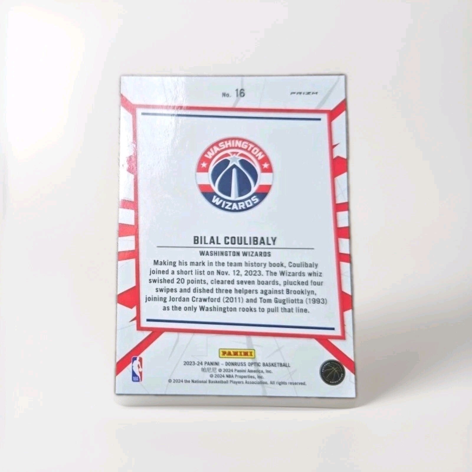The Bilal Coulibaly #16 23-24 Optic Purple Parallel My House Insert RC trading card is a sought-after collectible for basketball fans. This rookie card features the promising player from the Washington Wizards in the National Football league. The card is part of the 2023-24 Donruss Optic set, making it a valuable addition to any sports trading card collection. With its purple parallel variety and insert design, this card stands out as a unique and desirable item for enthusiasts looking to add a piece of basketball history to their collection.