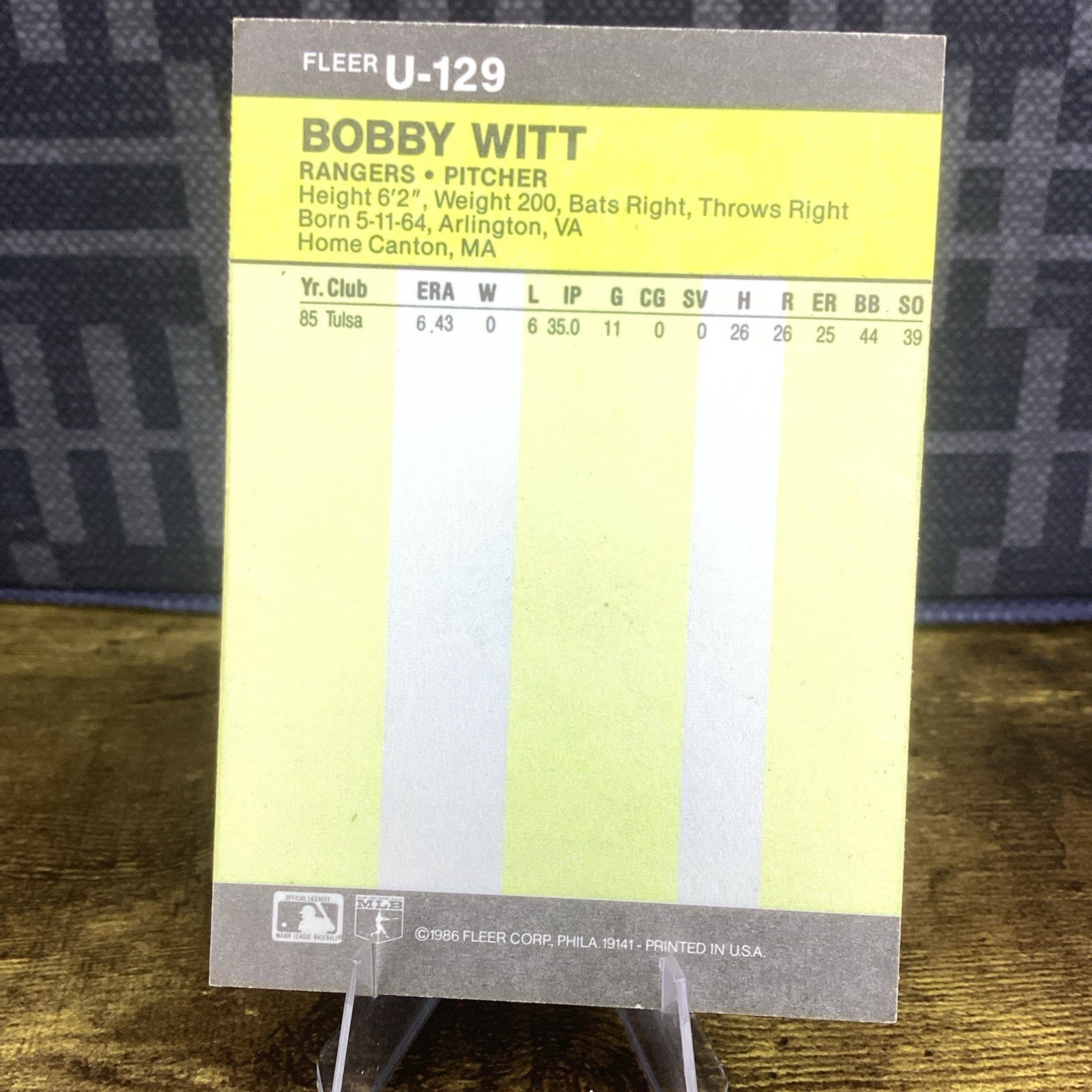 The Bobby Witt 1986 Fleer Update #U-129 baseball card is a sought-after sports trading card featuring the legendary player from the Texas Rangers. This original card, manufactured by Fleer in 1986, is made of sturdy card stock and showcases the rookie year of Bobby Witt. With its hard-signed signature and standard size, this baseball card is a valuable addition to any sports memorabilia collection, especially for fans of Major League Baseball (MLB) and collectors of vintage trading cards.