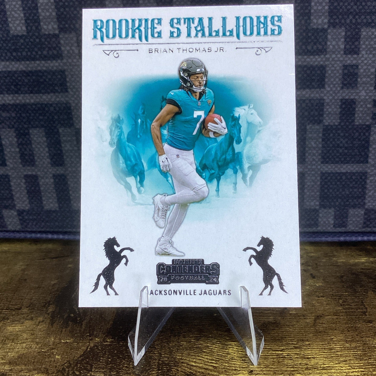 The product is a 2024 Panini Contenders- Rookie Stallions trading card featuring Brian Thomas Jr., a player in the National Football League (NFL) for the Jacksonville Jaguars. The card is made of card stock and was manufactured by Panini in the United States. It is an original English-language card with a base set, rookie designation, and insert features. With its unique Rookie Stallions parallel/variety, this sports trading card is a collectible item for fans of football and trading cards, showcasing a promising rookie player in the league.