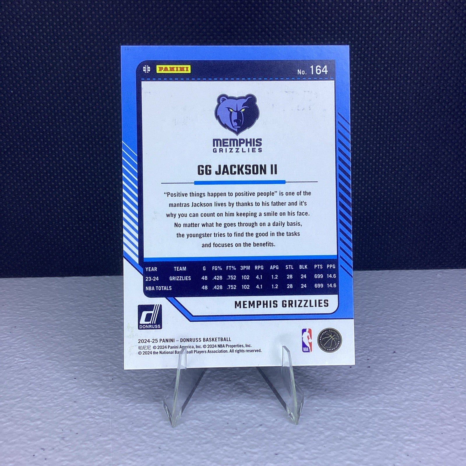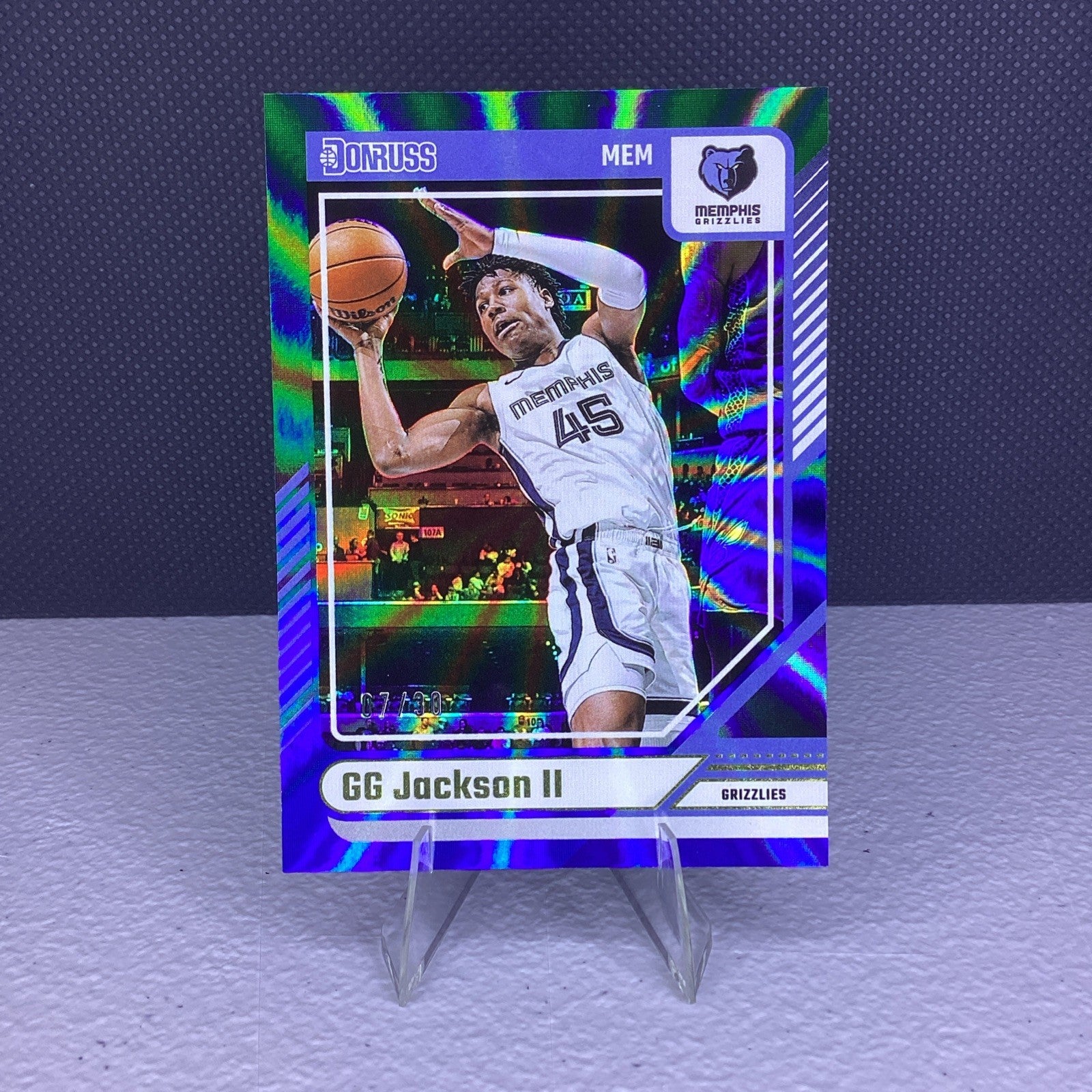 The GG Jackson 164 Green Laser 2024-25 Donruss trading card is a highly sought-after collectible for basketball fans. This limited edition card features player G.G. Jackson and is part of the 2024-25 Donruss set with a print run of only 30. Made of durable card stock with a thickness of 20 Pt., this original card is a valuable addition to any sports trading card collection. The green laser parallel variety adds a unique touch to this English-language card, making it a standout piece for fans of the National Basketball Association.
