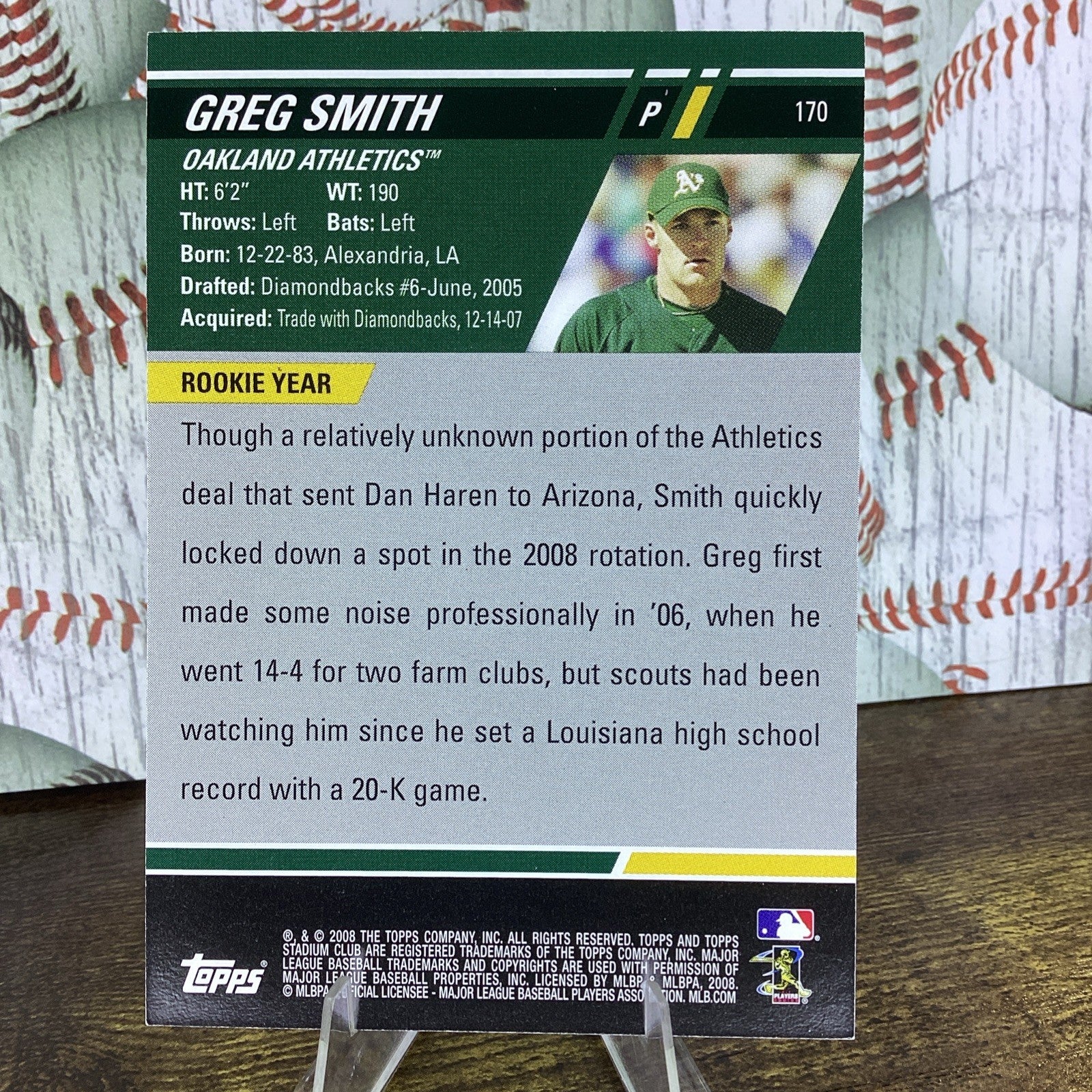 The product is a 2008 Topps Stadium Club baseball trading card featuring an autograph from Greg Smith of the Oakland Athletics. This autograph is hard-signed and authenticated by Topps, making it a valuable collectible for fans of Major League Baseball. The card is made of card stock and is an original release from Topps, adding to its authenticity and appeal to collectors. The card is in near mint condition and is a must-have for any baseball card enthusiast looking to add a unique piece to their collection.