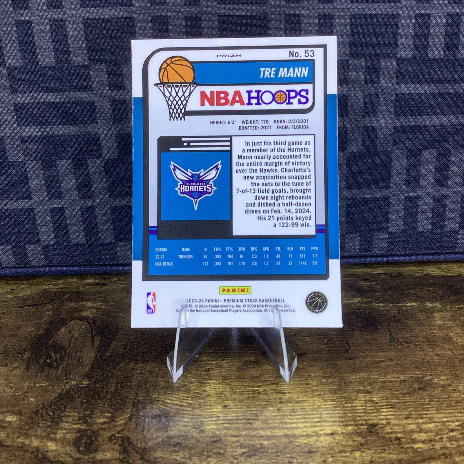 The product is a 2023-24 NBA Hoops Premium Stock Ice Prizm #53 trading card featuring Tre Mann of the Charlotte Hornets. Manufactured by Panini, this standard-sized sports trading card is part of the 2023-24 NBA Hoops set and is in English language. The card showcases a parallel variety design, making it a unique addition to any basketball card collection. This collectible item is a must-have for fans of the NBA and Tre Mann.